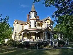 This two-story, asymmetrical frame dwelling is the area's most distinctive Queen Anne residence.[3] The house was originally constructed in 1893 as a Methodist school, then enlarged and remodeled in its present style in 1908 by John Jacob Rawl, using modified George F. Barber plans to include the one room school house as the new dining room. The house has a one-story wraparound porch, supported by turned posts, with an elaborate arched spindle frieze and turned balusters. A three-story shingle clad turret, with a conical roof rises at the left side of the facade; it is a balanced by a gabled pavilion on the right, with an intricately sawn bargeboard. A second-floor balcony between the turret and the pavilion has a spindle frieze, repeating that of the main porch. The foundation of the house is brick; the roof is original sheet metal shingles. Two corbeled chimneys pierce the central block's steep hip roof. A multi-paned transom and side lights frame the front door.