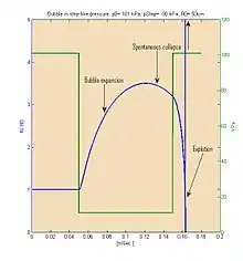 Numerical integration of RP eq. including surface tension and viscosity terms. Initially at rest in atmospheric pressure with R0=50 um, the bubble subjected to pressure-drop undergoes expansion and then collapses.