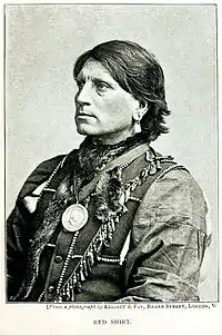 Red Shirt (Oglala Lakota: Ógle Ša in Standard Lakota Orthography) (c. 1847 – January 4, 1925) was an Oglala Lakota chief, warrior and statesman. Red Shirt supported Crazy Horse during the Great Sioux War of 1876-1877 and the Ghost Dance Movement of 1890, and was a Lakota delegate to Washington in 1880. Red Shirt surrendered with Crazy Horse in 1877. After the surrender he moved to an area that is now known as Red Shirt, SD. Red Shirt was one of the first Wild Westers with Buffalo Bill's Wild West and a supporter of the Carlisle Native Industrial School. Red Shirt became an international celebrity Wild Westing with Buffalo Bill's Wild West and his 1887 appearance in England captured the attention of Europeans and presented a progressive image of Native Americans.