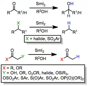 Samarium(II) iodide is a one-electron reductant, and typically effects reduction through a series of electron transfer and proton transfer (from protic solvent) steps.[4][3] Reducible functional groups include: