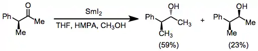Samarium(II) iodide may be used to reduce ketones and aldehydes to alcohols; however, diastereoselectivity is low and a variety of more stereoselective methods exist.[16] Aldehydes may be selectively reduced in the presence of ketones.[5]
