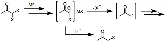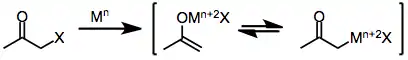 One-electron reducing agents, such as d6 or d1 transition metal complexes, initially donate a single electron to the halo ketone. Fragmentation of the resulting radical anion yields an organic radical and halide anion. Donation of a second electron from a second equivalent of reducing agent leads to the formation of a metal enolate in which the oxidation state of the reducing agent has increased by one.[6]