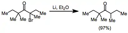 Monohalo ketones may be reduced to the corresponding parent ketone with lithium metal, followed by protonation of the enolate.[11] Other useful reducing agents for this transformation include lithium dialkylcuprates[12] and molybdenum hexacarbonyl-alumina.[13]