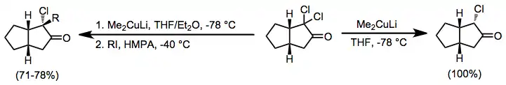 Depending on the conditions employed, geminal dihalo ketones may be reduced to the parent ketone, monohalo ketone, or functionalized monohalo ketone with organocuprates.[17] Warming functionalized α-halo ketones produced under these conditions from −40 °C to room temperature leads to the corresponding α,β-unsaturated ketone.