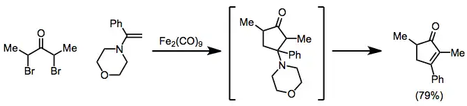 The 2-oxyallyl metal intermediates generated during reductions of α,α'-dihalo ketones with iron(0) complexes participate in [4+3] and [3+2] cycloaddition reactions to form cycloheptenones and cyclopentanones, respectively. During [3+2] cycloaddition reactions, the substituent on the alkene may eliminate to provide cyclopentenones from alkenes in one pot.[20]
