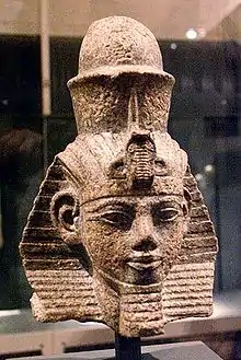 Nicknamed the "blue crown", the khepresh is a late headgear reserved exclusively for pharaohs. It appeared at the end of the Middle Kingdom, but only became common during the 18th and 19th dynasties, when the rulers were in battle.[19] The headdress is relatively tall, bulbous and studded with numerous small circular golden lozenges. For a long time, Egyptologists mistakenly considered this headdress to be an iron war helmet, as the ruler wore it quite frequently in battle scenes, during military parades or at certain religious celebrations such as the Min Festival. It is in fact a distinctive sign of the monarch, a mark of triumph, probably made of fabric or leather.[20]