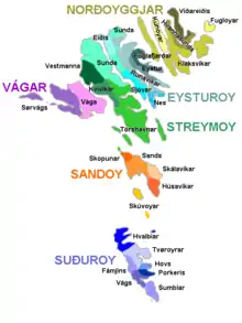 The Faroe Islands are divided into 29 municipalities, six regions/shires (sýsla, sýslur in plural) and since 2007 there has been only one constituency, earlier there were seven constituencies.[1][2] Each region has one sheriff (sýslumaður).