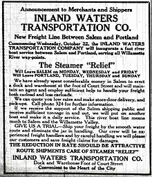 On October 19, 1924, the Inland Waters Transportation Company announced that it would inaugurate steamboat service, using Relief, running on the Willamette River from Salem to Portland.[34] Relief was to depart Salem for Portland at 6:00 a.m. every Wednesday, Friday, and Monday, and return to Salem on Tuesdays, Thursdays, and Sundays.[34] Capt. Fritz Kruse was to have command of Relief.[34] Robert Kerns was to be the chief engineer.[34] Freight alone would be carried, and no passengers.[34] To receive freight, the company had built a warehouse in Salem at the intersection of Court and Water streets.[34]
