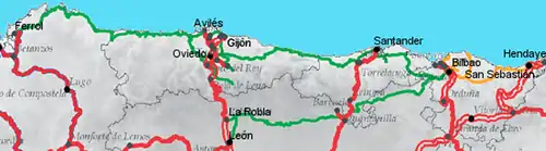 - ↑ greenspain extract: "The remaining 650 km to the Atlantic coast are on the network of the FEVE" (Op the Google Map (See ) the distance is calculated at 641 km, estimated margin of error 0,5%).