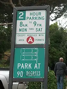 Residential zoned parking is a local government practice of designating certain on-street automobile parking spaces for the exclusive use of nearby residents. It is a tool for addressing overspill parking from neighboring population centers (such as a shopping center, office building, apartment building, transit station, stadium, or central business district). Typically, residents in the zone pay a small fee to the government in exchange for a placard or sticker placed on their automobile(s) that indicates the zone designation (signified by a number or letter).