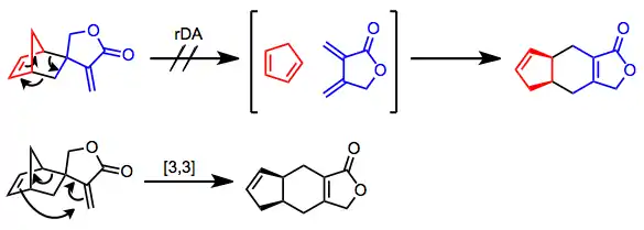The retro-Diels–Alder reaction proper is the microscopic reverse of the Diels–Alder reaction: a concerted (but not necessarily synchronous), pericyclic, single-step process. Evidence for the retro-Diels–Alder reaction was provided by the observation of endo-exo isomerization of Diels–Alder adducts.[6] It was postulated that at high temperatures, isomerization of kinetic endo adducts to more thermodynamically stable exo products occurred via an rDA/DA sequence. However, such isomerization may take place via a completely intramolecular, [3,3]-sigmatropic (Cope) process. Evidence for the latter was provided by the reaction below—none of the "head-to-head" isomer was obtained, suggesting a fully intramolecular isomerization process.[7]