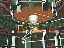 A major decision for the team was using wire frame graphics for everything from character models to environments, paying homage to early video game graphics such as were seen in the 1983 Star Wars game and Missile Command.[25] The decision to use this style was described by Yokota as "quite interesting", as his work on Panzer Dragoon had been aiming for the highest realism possible.[5] The graphics mirroring the music drew direct stylistic inspiration from the Winamp media player display.[21][22] All but Area 5 were created using the same methodology; the wire frame was in the level foreground, while any particle effects and other visual elements were placed in the background area. This was the only feasible way to synchronise the music and visuals.[5] The first four levels had different visual themes and two key colors each. The first area drew from Ancient Egypt and used red and orange, the second used Indian culture with blue and purple, the third used Mesopotamian designs and the colors green and cyan, while the fourth area drew from Chinese culture and had a yellow and green color design. Each stage boss had a name taken from one of the planets.[37] The final area had a design influenced by the natural world.[38] Kazdel described this last area as Yokota's "personal trip out level".[21]