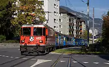 An Arosa line train pulled by a Ge 4/4 II electric locomotive on Engadinstrasse (part of the Stadtbahn) in Chur.