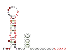 L20 ribosomal protein leader is a ribosomal protein leader involved in the ribosome biogenesis. It is used as an autoregulatory mechanism to control the concentration of ribosomal proteins L20. The structure is typically located in the 5′ untranslated regions of mRNAs encoding initiation factor 3 followed by ribosomal proteins L35 and L20 (infC-rpmI-rplT), but the regulated mRNAs always contain an L20 gene. A Rho-independent transcription terminator structure that is probably involved in regulation is included at the 3′ end in many examples of L20 ribosomal protein leaders. Three structurally distinct forms of L20 leaders have been experimentally established.[1] One such leader motif occurs in Bacillota and the other two are found in Gammaproteobacteria. Of the latter two, one is found in a wide variety of Gammaproteobacteria, while the other is only reported in Escherichia coli. All three types of leader exhibit apparent similarities to the region of Ribosomal RNA to which the L20 protein normally binds.[1] However, in terms of RNA secondary structure, the context of the similar region is distinct in each leader type.[1]