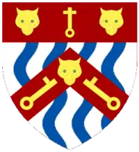 Argent four pallets wavy Azure on a chevron over all Gules a leopard's face between two keys wards upwards and outwards Or on a chief Gules a double warded key wards upwards between two leopard's faces Gold.