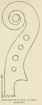 Tobin is regarded as one of the greatest ever scroll carvers, and his hand can be recognized on many instruments with the shop label of John Betts, Thomas Dodd, Samuel Gilkes and Henry Lockey Hill. Such was the quality of his scrolls that an outline of one was included in Rev. Morris' 1904 book British Violin Makers.[7] Despite his meticulous workmanship, he is said to have worked very fast, and apparently could finish a scroll inside of two hours.[4] Some of his instruments were signed internally on the table and occasionally branded below the back button, although authentic Tobin labels are extremely rare.