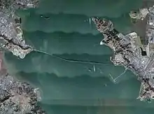 View from the east end of the bridge (Richmond) looking southwest toward Southern Marin. San Quentin State Prison is at the far end of the bridge (San Rafael), just beyond the edge of the picture on the right. Top right above the bridge is Mount Tamalpais. The broken pilings in the water in the middle left of the picture are the remains of the pier where the Richmond–San Rafael ferry docked before the bridge was built.