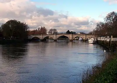 - ↑ London Bridge (circa 55 AD), Kingston Bridge (date of construction unrecorded, but renovated in 1193 so dating from the mid-12th century at the latest), Putney Bridge (1729), Westminster Bridge (1739), Hampton Court Bridge (1752), Kew Bridge (1759), Blackfriars Bridge (1769) and Battersea Bridge (1771) predate Richmond Bridge, but have all been demolished and replaced since the construction of Richmond Bridge.