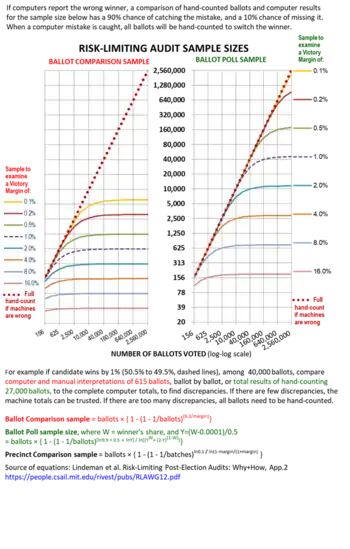 The process starts by selecting a "risk limit", such as 9% in Colorado,[12] meaning that if there are any erroneous winners in the initial results, the audit will catch at least 91% of them and let up to 9% stay undetected and take office.[8][2] Another initial step is to decide whether to audit: all contests; a random sample of contests, allowing a known risk that erroneous winners will take office; or a non-random sample, so no statistical confidence is available on the non-audited contests. Based on a formula, a sample size is determined for each contest being audited.[13][8][14] The size of the sample depends primarily on the margin of victory in the targeted contest.