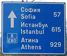 Both normative documents are harmonized with the Vienna Convention on Road Signs and Signals (1968), which was ratified by Bulgaria on December 28, 1978 (This Convention was not published in the State Gazette).[4] Bulgaria made two declarations upon signature, one reservation upon ratification and one declaration upon ratification. One reservation made upon ratification is regarding transliteration into Latin characters solely to indicate the terminal points of international routes passing through Bulgaria and places of interest to international tourism. This is due to the fact that the Cyrillic script is used in the writing system of the Bulgarian language, the official language of Bulgaria.