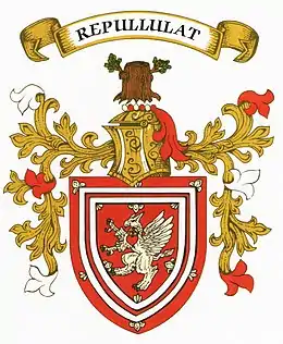 The son of Robert Lauder of Belhaven and West Barns, Dunbar (d. c. 1672), by his spouse Marie (d. before July 1657), daughter of Patrick Douglas of Standingstone[3] by his wife Christian, daughter of Andrew Leslie, of Inverdovate, Fife,[4] Robert jnr is mentioned in his mother's Testament. Some time between 1672–1677 Robert Lauder, portioner (landowner) of Belhaven and West Barns, matriculated Arms as a direct descendant of the family of Lauder of The Bass.[5] The motto over the crest means it sprouts forth again. It is unclear if he then changed his designation to 'of Beilmouth' or whether he did so when he was knighted, some time in the 1690s.