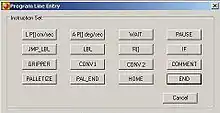 The RoboLogix instruction set contains 16 commands, which are usually written as a program on a line-by-line basis. These commands are used to instruct the robot to perform tasks such as moving to a specific location, picking up an object, executing a subroutine, waiting, etc. One of the more popular commands in the instruction set is the IF instruction, which compares numerical values located in two registers. If a register has a value that is greater than (>), less than (<), greater than/equal to (>=), less than/equal to (<=), equal to (=), or not equal to (<>) another register, it will execute the next line in the program if the condition is true. The IF command is often used with the JMP LBL instruction to control program execution.