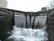 A lock on the Rochdale Canal with water flowing over the gate