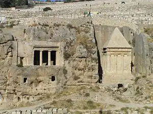 The most elaborate group of tombs was in the Kidron Valley across from the Temple Mount. These include the Tomb of Benei Hezir, that belonged to a priestly family also known from the Hebrew Bible, with the adjacent so-called Tomb of Zechariah monument (actually not a tomb), and the Tomb of Absalom along with the Cave of Jehoshaphat located behind it.[9][8]