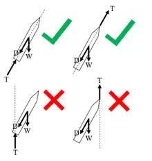 Illustration of the pendulum rocket fallacy. Whether the motor is mounted at the bottom (left) or top (right) of the vehicle, the thrust vector (T) points along an axis that is fixed to the vehicle (top), rather than pointing vertically (bottom) independent of vehicle attitude, which would lead the vehicle to rotate.