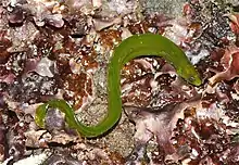 The rockweed gunnel has a translucent body which varies in color from bright green to a reddish-brown and its color is determined by their environment. Fish living among green seaweed are green and fish living among brown seaweed are reddish brown. It has a long, thin eel-like body with small fins, each roughly equal in size to the diameter of their eye and too small to be used in swimming. The spine in the anal fin has a length which is 40% of the length of the head and has a sharp point, tilted forward.[5] This fish has 83 or 84 spines in its dorsal fin and a single spine and between 32 and 38 soft rays in its anal fin. It has a rounded caudal fin. Its maximum published total length is 23 cm (9.1 in).[1]