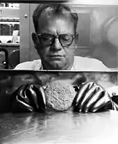 Worker holding plutonium "button" in glove box