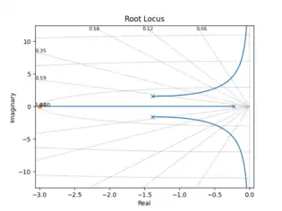 The following Python code can also be used to calculate and plot the root locus of the closed-loop transfer function using the Python Control Systems Library[14] and Matplotlib[15].