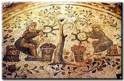 ![]() Mosaic depicting the weaving of rose wreaths.(Villa del Casale, 4th century) | |