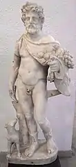 Although scholars have become less inclined to view Attis within the rigid schema of "dying and rising vegetation god", the vegetal cycle remains integral to the funerary nature of his rites.[139] The pine tree and pine cones were introduced to the iconography of Attis for their cult significance during the Roman period.[140] A late 1st- or 2nd-century statue of Attis from Athens has him with a basket containing pomegranates, pine cones, and a nosegay of violets.[141]