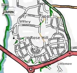 The residential estate of Rose Hill is largely to the west of the road of the same name. The road is part of a historic route from Oxford to London via Henley, running parallel to the river Isis (the name of the Thames in Oxford). The centre of Rose Hill estate is the Oval, a large expanse of grass in the centre of a turning circle. On the Oval is Rose Hill Primary School (formerly Rose Hill First). Adjacent to the Primary School is the Rose Hill Community Centre, formally opened in 2016. A focal point of the road of Rose Hill is a small landscaped triangle adjacent to a row of shops built in the 1940s that have a part-timbered Tudor style facade.