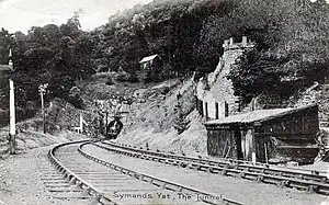Continuing to follow the south bank of the river, the line passed through Symonds Yat (433 yards) where the river takes a northward sweep. The railway then ran past Hadnock to Monmouth May Hill station, crossing the River Wye by Monmouth Viaduct, and finally arriving at Monmouth Troy station.[9][10][1][5]