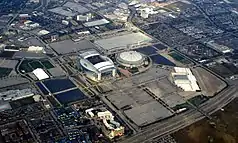 (2009), facing northeast. NRG Stadium was built west of the Astrodome. The AstroWorld site is a cleared area across I-610 from the stadia (lower right corner), and the Astroworld Hotel is visible (bottom center edge).