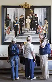 One of the highlights of the Parade is Trooping the Colour. The Colour trooped is the Sovereign's Banner and the current banner is the third generation of itself, presented by Elizabeth II in March 1999;[33] the first Sovereign's Banner, known as the "King George V's Banner", was presented by George V on 6 November 1918[34] and the second one was presented by Queen Elizabeth on 27 October 1978.[35]