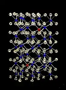 Crystal structure of ruby showing the substitution of Al3+ ions (blue) with Cr3+ (red). The substitution density of Cr3+ ions in this model is approximately 2%, approximating the maximum doping normally encountered.[5]
