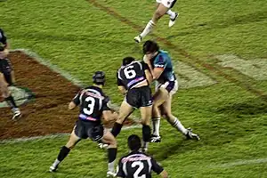 The defensive team tries to stop the attacking team from scoring by tackling the player with the ball as quickly as possible to prevent him gaining more ground. A tackle forces a halt in play for as long as it takes the tackled player to return to his feet and play the ball. In that time, the defending team, with the exception of two markers, must move back a minimum of 10 metres towards their end of the field. The attacking team restarts play and continues with its next chance to score via the play-the-ball. After each tackle the attacking team should be closer to their opposition's end of the field. A 2012 New Zealand study found that over 659 tackles are made per game in professional rugby league.[4] Of all the rugby league positions, second-row averages the most tackles.[5]