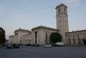 Ruse Central railway station (Bulgarian: Централна железопътна гара Русе, romanized: Tsentralna zhelezopatna gara Ruse) is the main station serving the city and municipality of Ruse, the fifth most populous city in Bulgaria. After the opening of the Danube Bridge in 1954, a new grand Stalinist Central Railway Station was envisioned for the city of Ruse. The new station opened in late 1955 temporarily becoming the biggest on the Balkan peninsula featuring three platforms, with four tracks and one passing track.