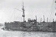 Immediately following her repairs she ran aground outside Vladivostok on 13 October and was not ready for sea until February 1905.[22] The Russians took this opportunity to reinforce her armament with six more 6-inch guns mounted on her upper deck, protected by lightly armoured casemates. Her armament was rearranged as well with her foremost six-inch guns moved from their casemates to the forecastle and the rearmost six-inch guns moved forward. Room for these changes was made by removing many of her lighter guns; she retained only nineteen 75 mm and two 37 mm guns. She also received several Barr and Stroud rangefinders at this time.[3] While testing her new Telefunken radio equipment on 24 May she struck a mine near her forward boiler room. She was able to return to Vladivostok for repairs, but took no further part in the war.[22]
