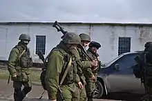 The 2014 annexation of Crimea was described in the West as maskirovka. As the BBC writer, Lucy Ash put it: "Five weeks later, once the annexation had been rubber-stamped by the Parliament in Moscow, Putin admitted Russian troops had been deployed in Crimea after all. But the lie had served its purpose. Maskirovka is used to wrong-foot your enemies, to keep them guessing."[8] The area was swiftly occupied by so-called little green men,[67] armed men in military trucks who came at night, with no insignia, so that even pro-Russian activists did not understand what was happening.
