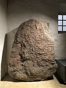 The Sønder Vinge stone 2 or DR 83 is a Viking Age runestone engraved in Old Norse with the Younger Futhark runic alphabet. The stone is in granite and was discovered in 1866 as a corner stone of Sønder Vinge Church, positioned with the runic inscription outwards.[1] It is presently located in the porch of the church.[1] It is probably from the period 970-1020 due to runic and linguistic features.[1] It is 180 cm tall, 132 cm wide and 35 cm thick.[1] Parts of the runic inscription have eroded which makes some runes hard to read.[1] The style of the runestone is the runestone style RAK.[2]