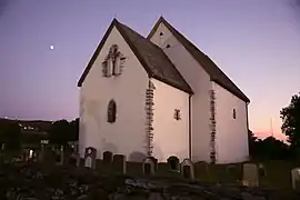 The earliest existing historical records of the church date back to the year 1280, but it was likely built around the year 1140. The Romanesque stone church has a rectangular nave and narrower, rectangular chancel. According to tradition, the church was owned for a time by Queen Margrete Skulesdatter. During the restoration in 1883, the windows were greatly expanded and given a neo-Gothic shape, and the steeple which had stood on the roof for hundreds of years was removed. The church was restored in again in 1966, under the leadership of Håkon Christie. Windows and portal openings, which had been greatly expanded in the 19th century, were then restored to their original form and size, including the use of the medieval frame stones, which had been preserved. The stone altar in the choir is the only thing left of the original inventory. The baptismal font is also from the Middle Ages, but the rest of the furniture is newer.[3]