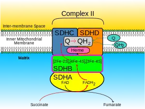 The gene that codes for the SDHB protein is nuclear, not mitochondrial DNA. However, the expressed protein is located in the inner membrane of the mitochondria. The location of the gene in humans is on the first chromosome at locus p36.1-p35. The gene is coded in 1,162 base pairs, partitioned in 8 exons.[5] The expressed protein weighs 31.6 kDa and is composed of 280 amino acids.[8][9] SDHB contains the iron-sulphur clusters necessary for tunneling electrons through the complex. It is located between SDHA and the two transmembrane subunits SDHC and SDHD.[10]
