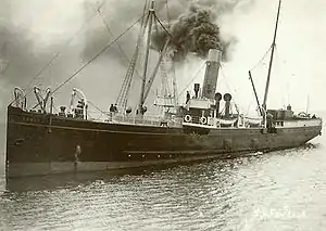 A mystery was created six weeks on from her sale, in November 1929, when one of Fenella's lifeboats was washed ashore at Barmouth in Cardigan Bay following a gale.[41] Inscribed on the lifeboat were the words "SS Fenella, Douglas," and within the boat were several pairs of oilskins.[41] It transpired that as well as purchasing the Fenella at the auction, John Cashmore had also purchased the Liverpool dredger, the Brancker,[41] which was also destined for scrapping.[41] When the Brancker had left the Mersey under tow from a tug, one of the Fenella's lifeboats had been placed aboard her.[41] During the course of the tow, the Brancker broke adrift in a gale,[41] forcing the four men on board her to take to the lifeboat.[41] After several hours the men were rescued by the steamer, City of Lyons,[41] and the lifeboat was then cast adrift, subsequently ending up being washed ashore at Barmouth.[41]