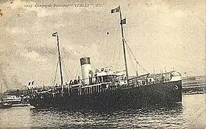 Italia's owner was the Compagnie Marseillaise de Navigation à Vapeur, and her managers were Fraissinet et Compagnie. They registered her at Marseille. Her code letters were JPKF.[1] By 1914 Italia was equipped for wireless telegraphy. Her call sign was FRI.[3]