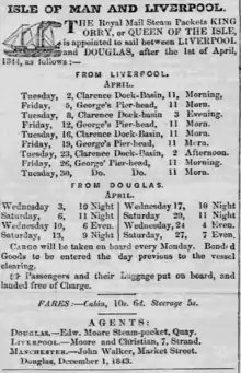 Advertisement of passage between Douglas and Liverpool on board the King Orry and Queen of the Isle.