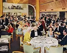 The First Class dining saloon had columns covered in gold leaf, tinted mirrors, ivory walls, satinwood furniture, and a Moroccan leather ceiling with Murano glass light fixtures. Like the First Class dining saloon of Normandie, it had no portholes or windows to the sea, and relied solely on artificial lighting.[8] There were four escalators for stewards to use when serving the cabin class and tourist class dining saloons.[9]